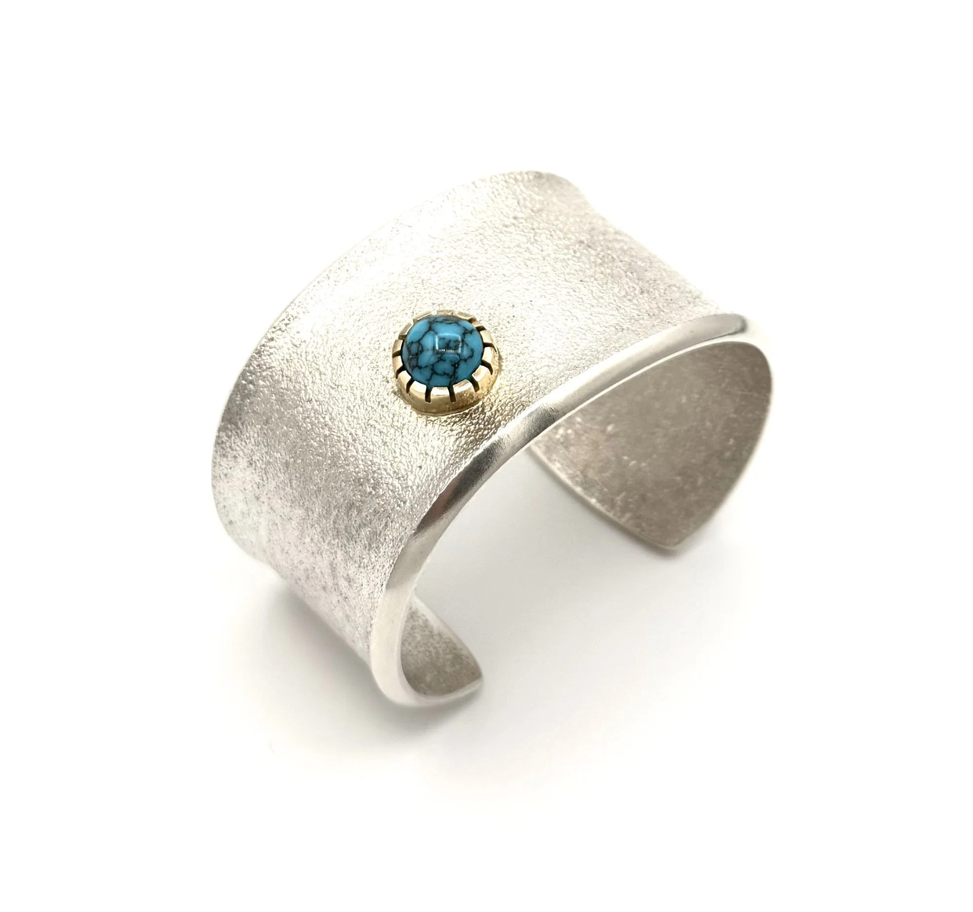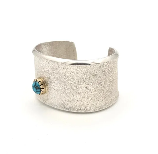 This tufa cast sterling silver bracelet, by artist Aaron Anderson, is approximately 1 5/8” in width. It measures 5 1/2” from terminal to terminal with an opening of 1”.